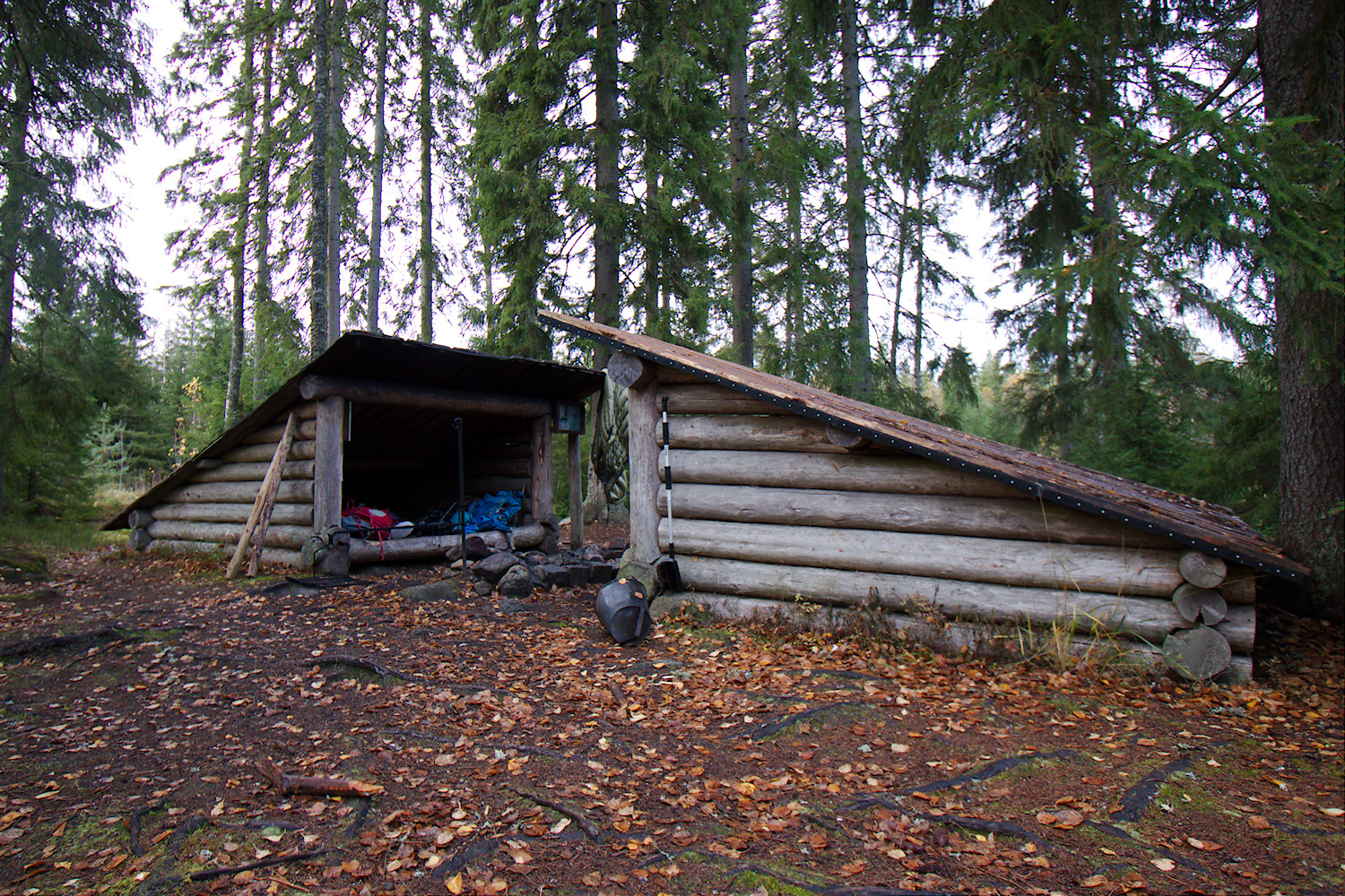 Lokakuun pimeässä illassa ajoin melkein ohi Koveron pienestä, merkitsemättömästä, parkkipaikasta. Parkissa oli muutama auto ja aivan tien läheisyydessä näkyi nuotion loimotus. Tämäkään ei olisi ollut hullumpi paikka jäädä yöksi. Me nostimme kuitenkin rinkat selkään ja siirryimme metsäautotietä pitkin kilometrin päässä olevalle Kymppilaavulle.