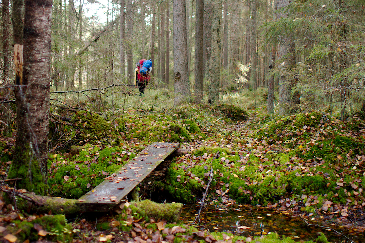 Sudenpesänkankaan jälkeen käännyimme takaisin pohjoiseen, tarkoituksenamme suunnata yöksi Keltaojan laavulle. Alkoi olla jo hämärää, kun kuljimme Keltaojan vartta, suurten lehtikuusten varjossa. Jaloissakin jo painoi päivän seikkailut.